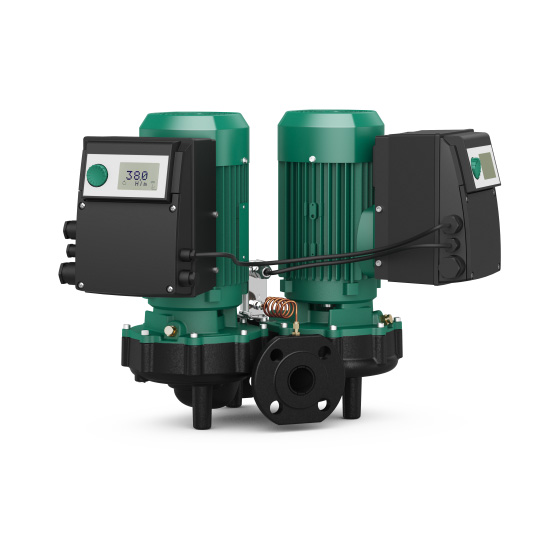 Электронно регулируемый сдвоенный насос с сухим ротором в исполнении Inline, с фланцевым соединением и автоматической регулировкой мощности